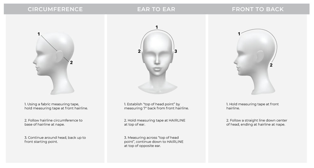 To determine the right size wig for you, measure the circumference of your head from the front hairline, behind your ear, to the nape of your neck, to your other ear and then back to the front hairline.